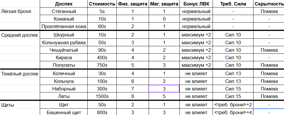Бонус Защиты от Доспеха: В таблице доспехов указаны два значения: Бонус Физ. Защиты и Бонус Маг. Защиты. Эти бонусы добавляются к соответствующему броску Защиты. Тяжелые доспехи обычно сильнее в физической защите, но слабее в магической.